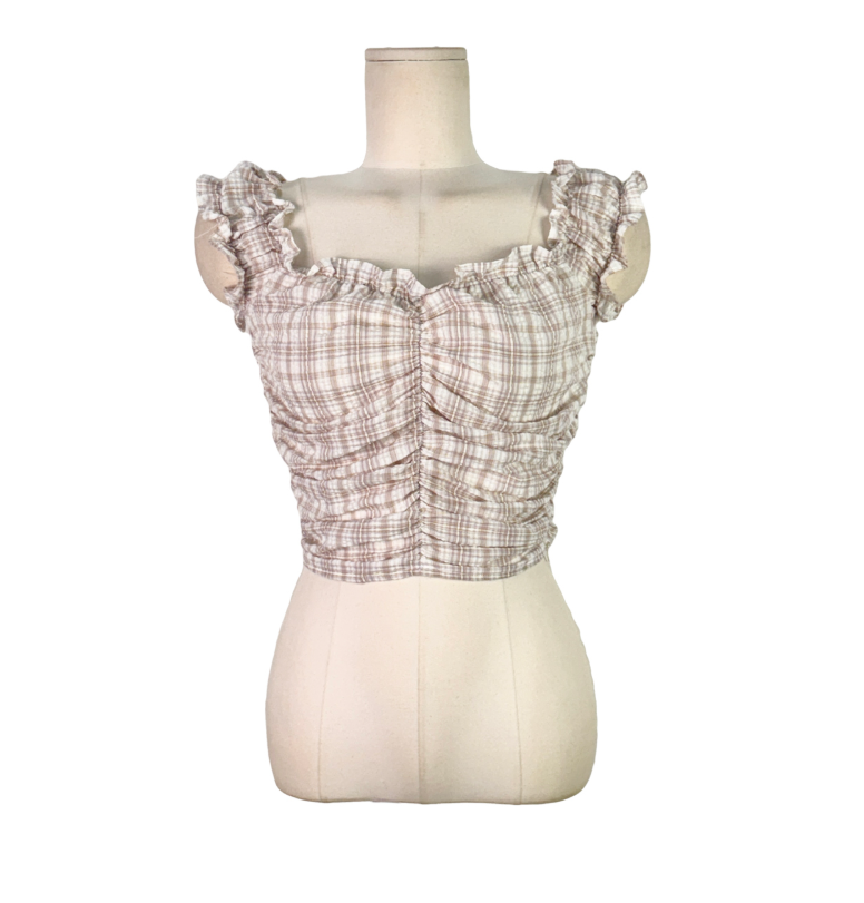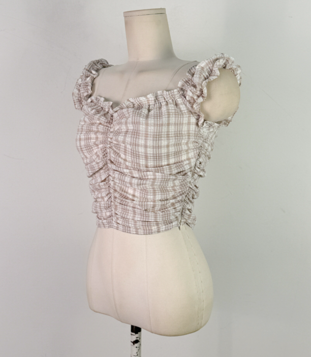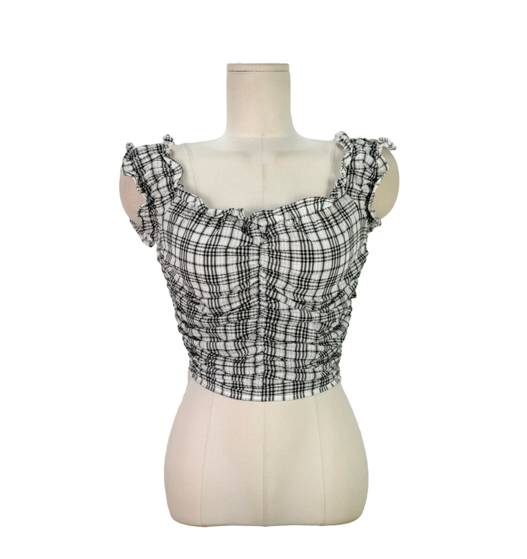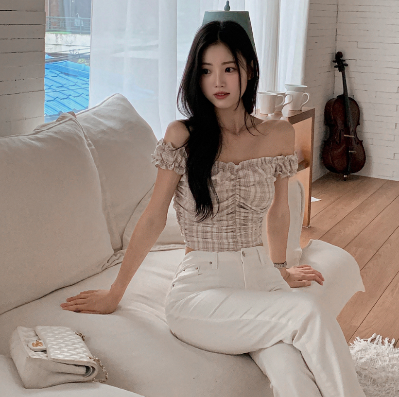 (•‾⌣‾•)有彈性吊帶泡泡款上衣💕露肩設計清爽格紋有點心思不失單調❤️