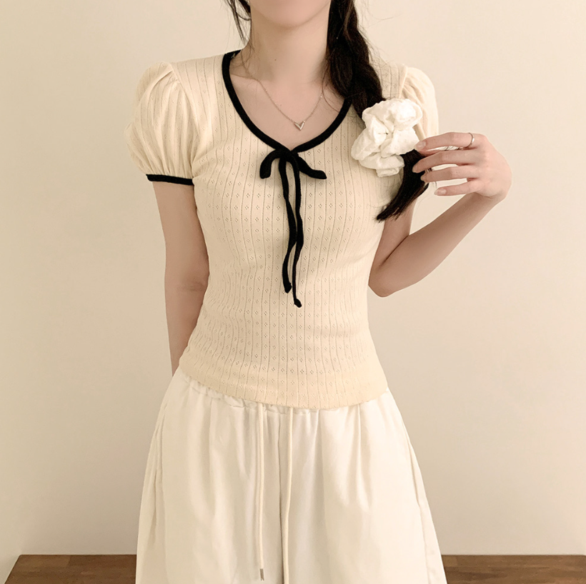 (•‾⌣‾•)簡單蝴蝶結針織短袖T恤💕下身襯裙或者褲都好好睇❤️