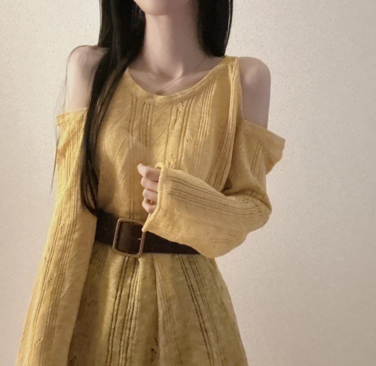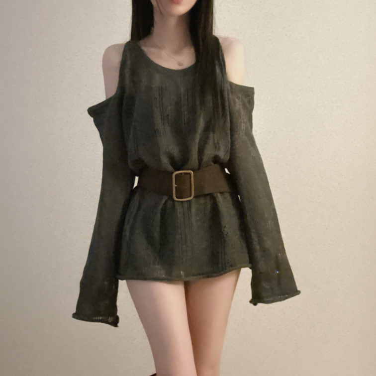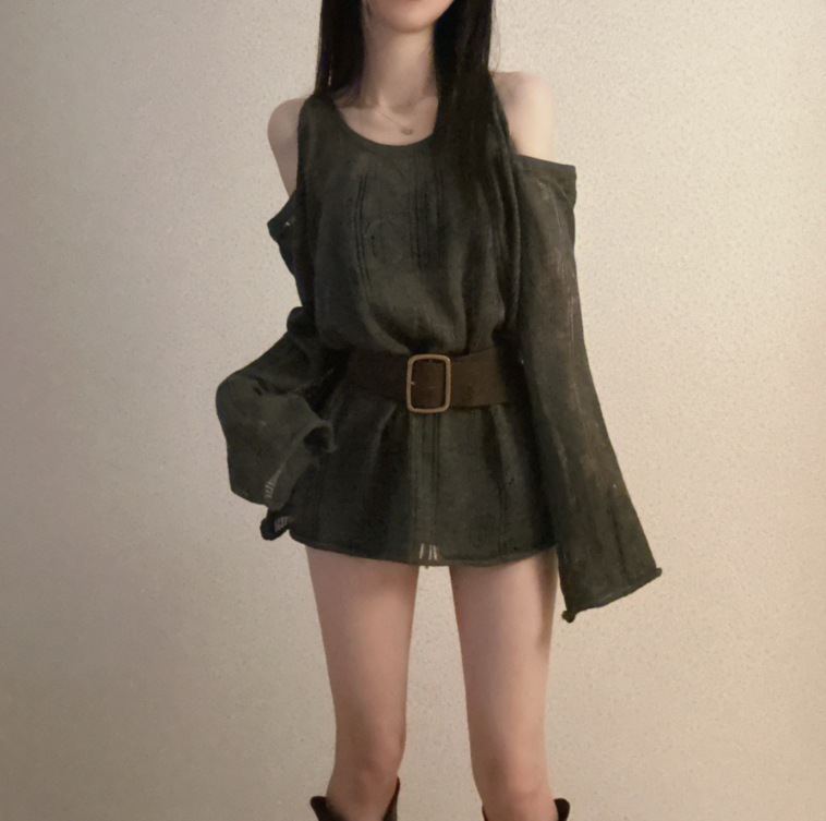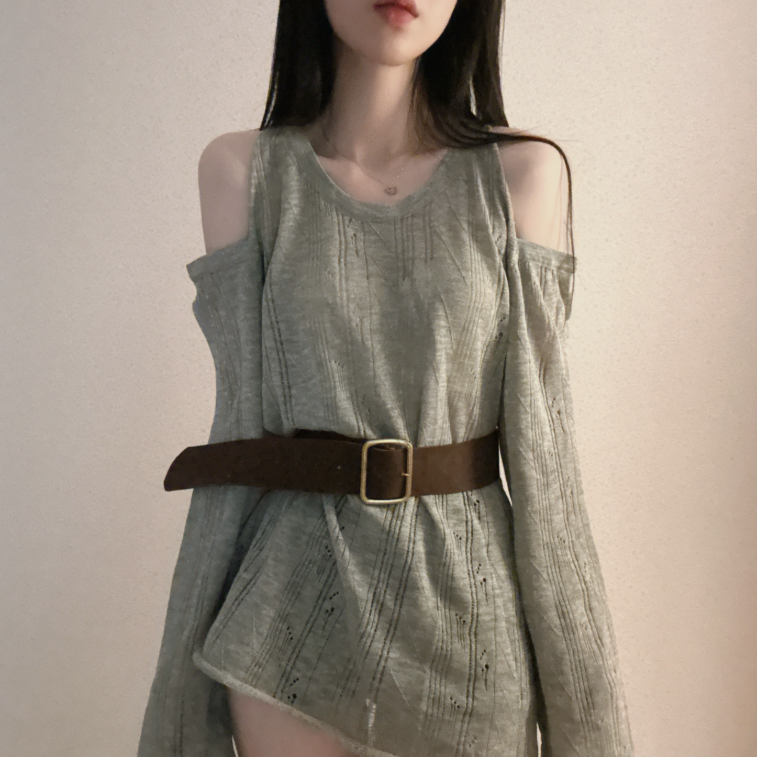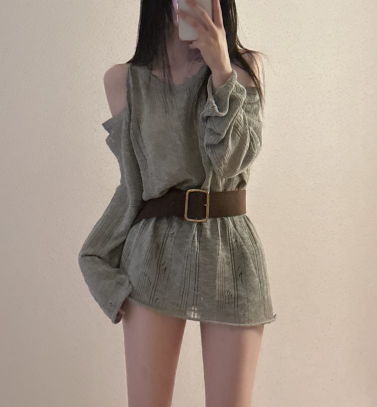(•‾⌣‾•)露肩寬鬆針織❤️套裝配上粗腰帶可以修飾腰線💕