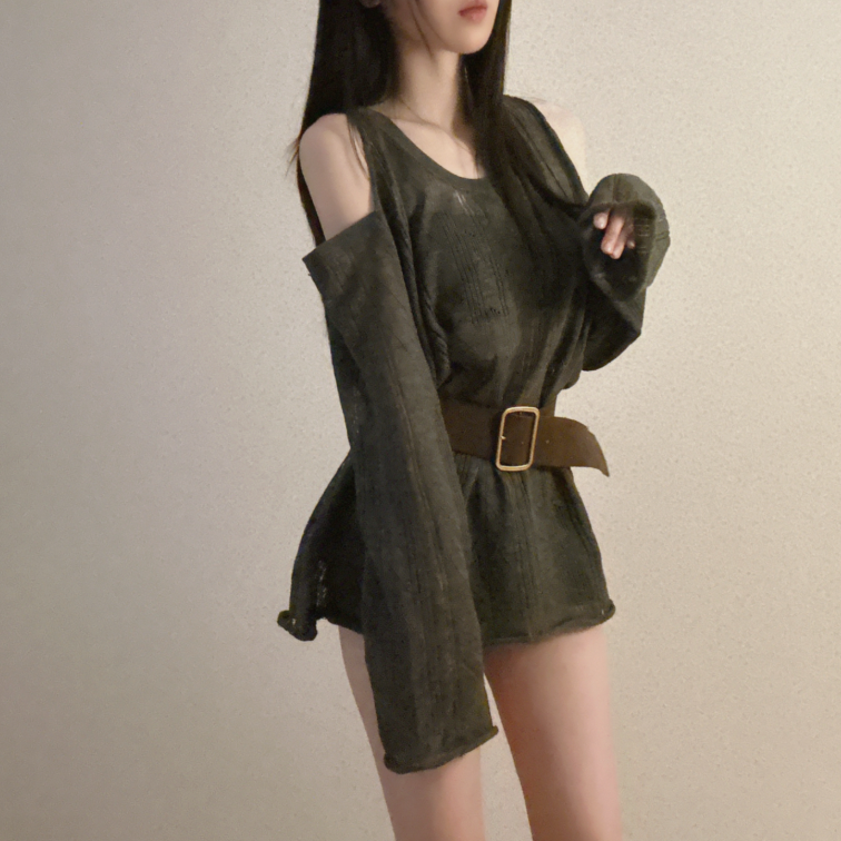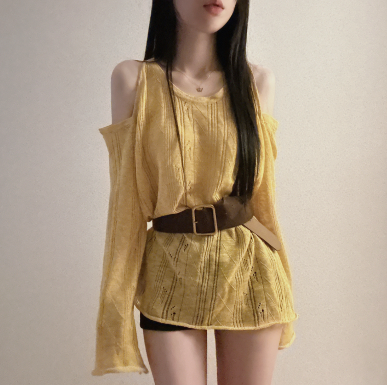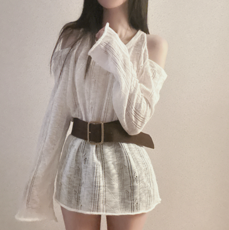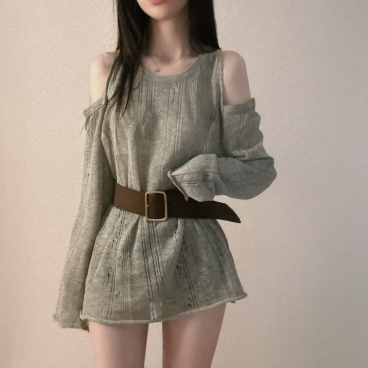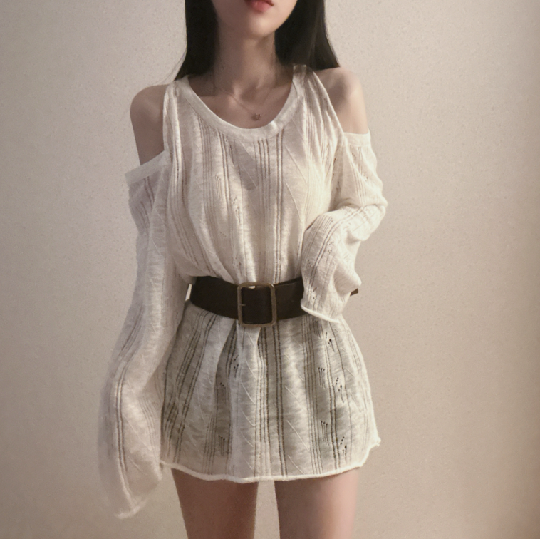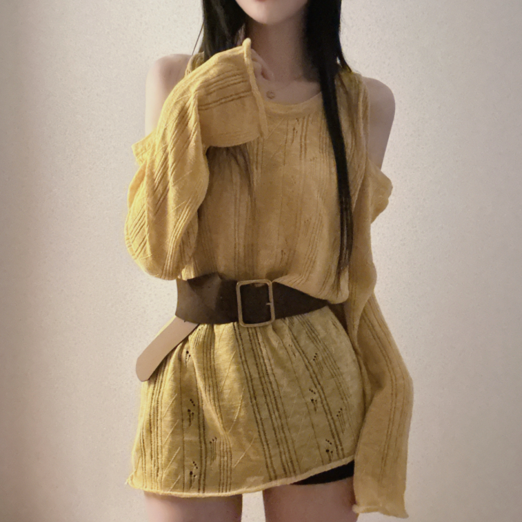 (•‾⌣‾•)露肩寬鬆針織❤️套裝配上粗腰帶可以修飾腰線💕