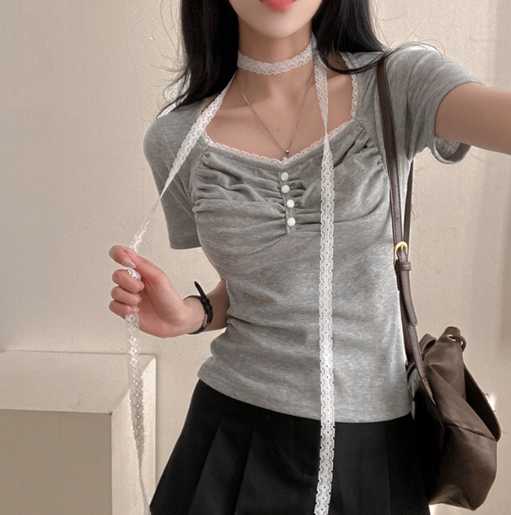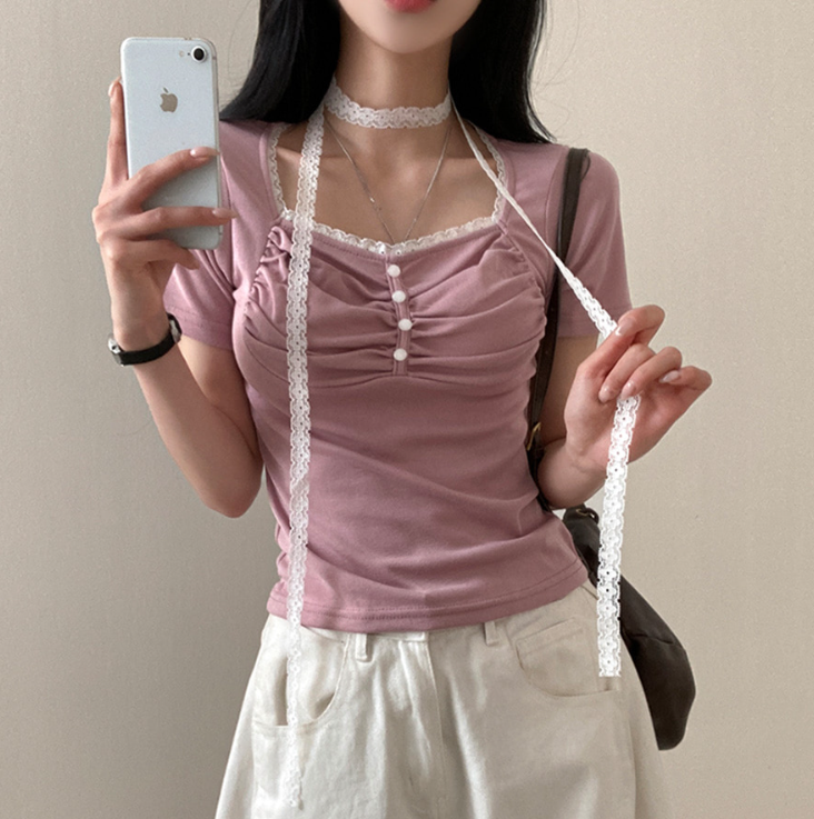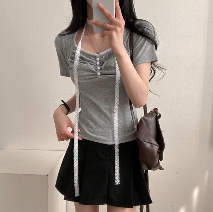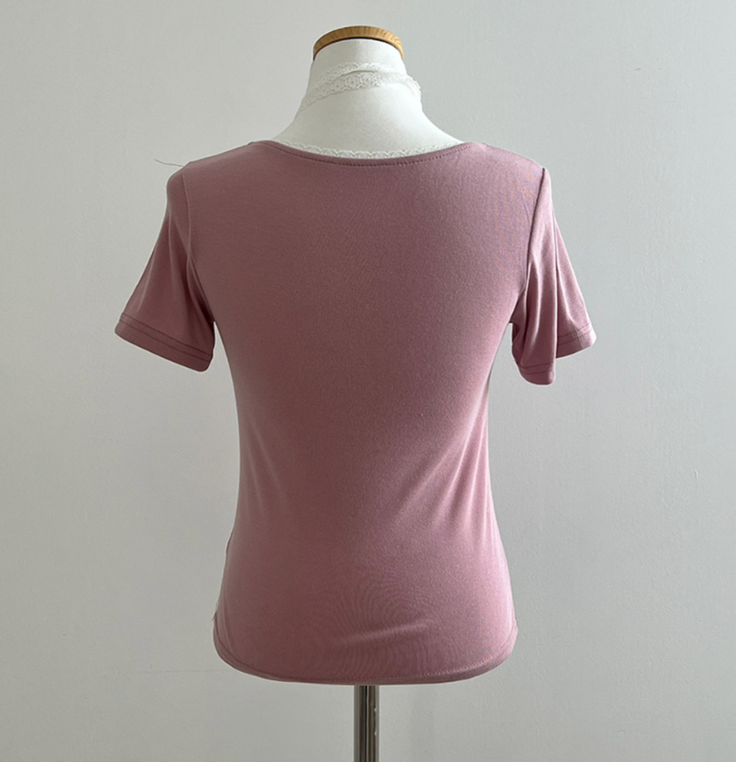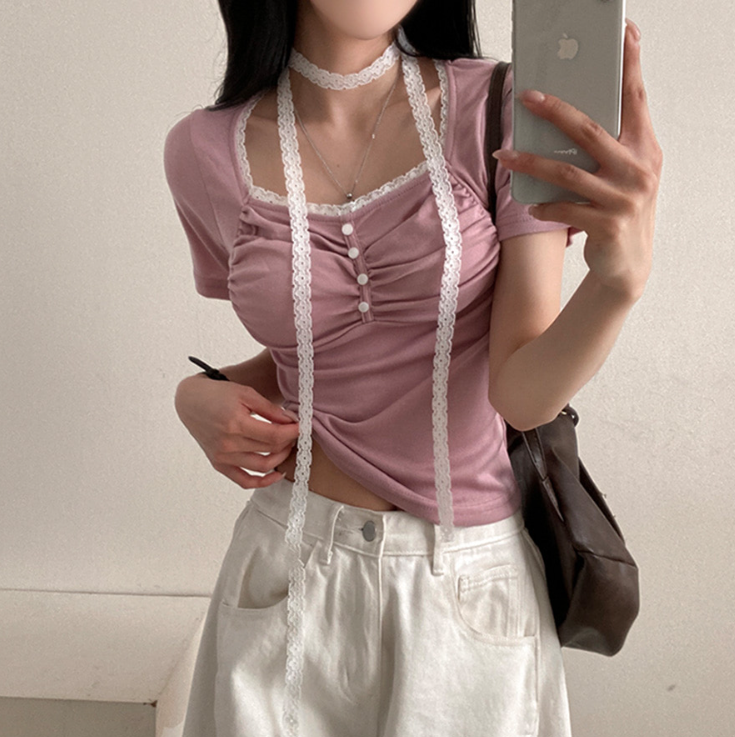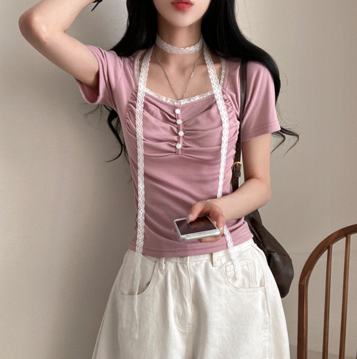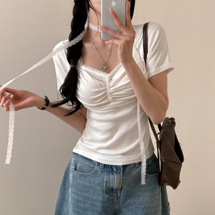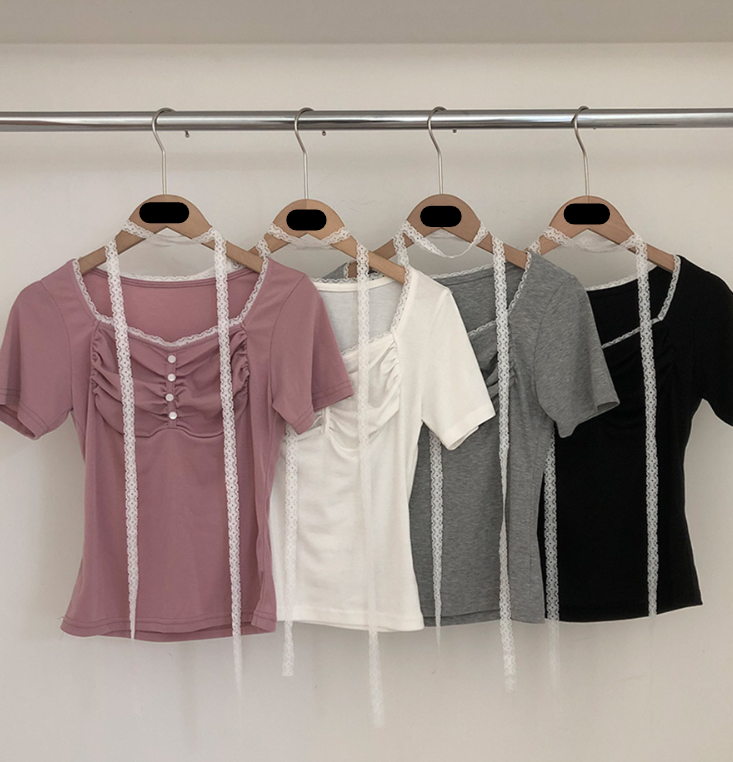 (•‾⌣‾•)領位皺皺設計更顯胸型美感💕比普通T恤更有特色❤️配上小蕾絲美觀又獨特