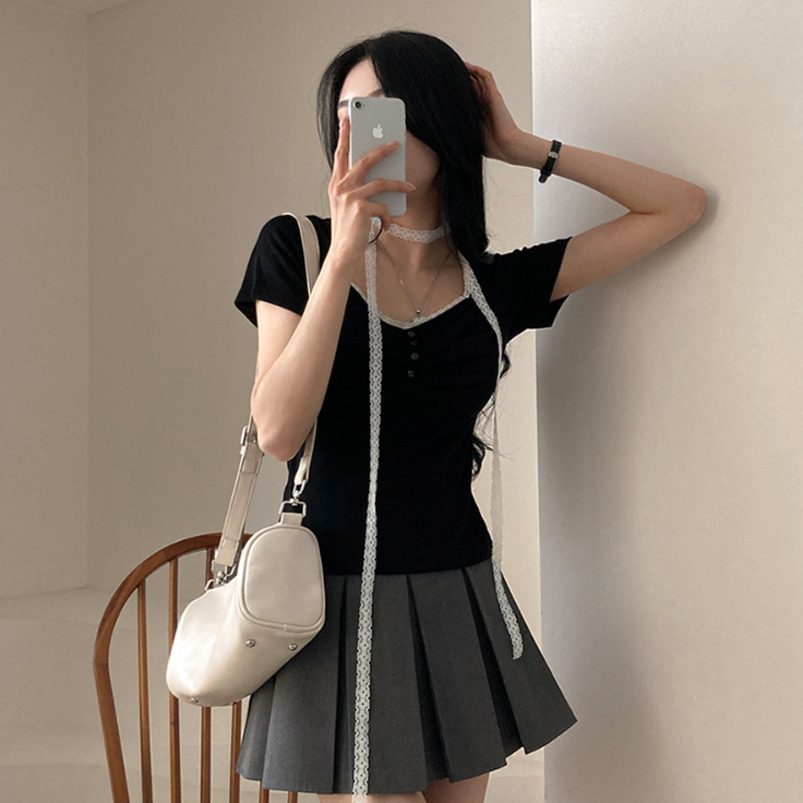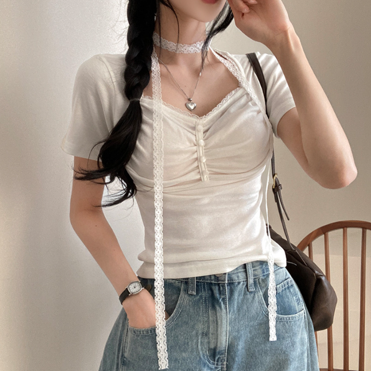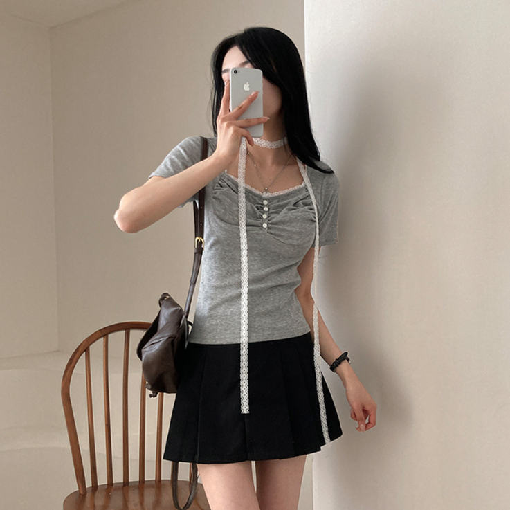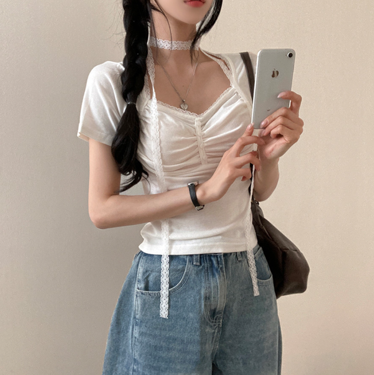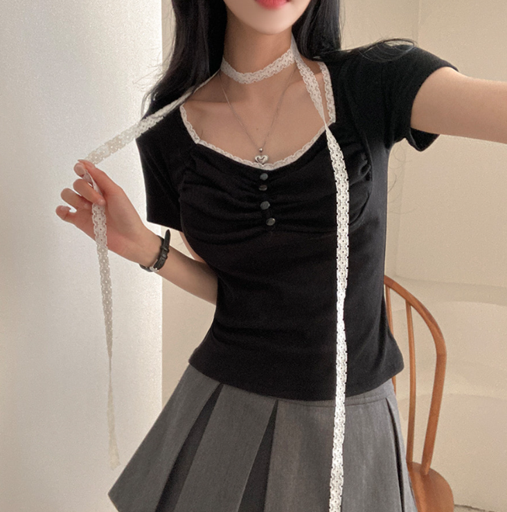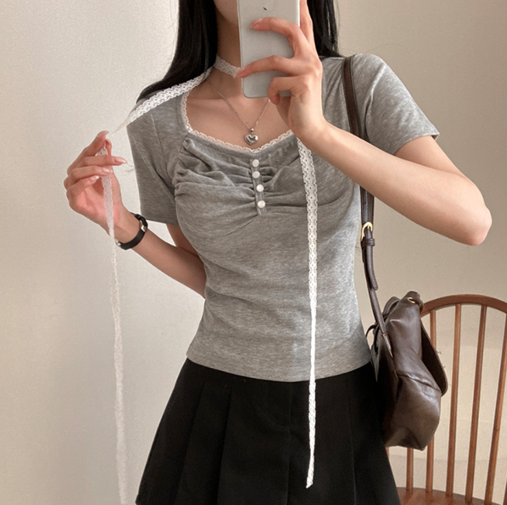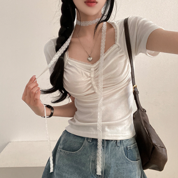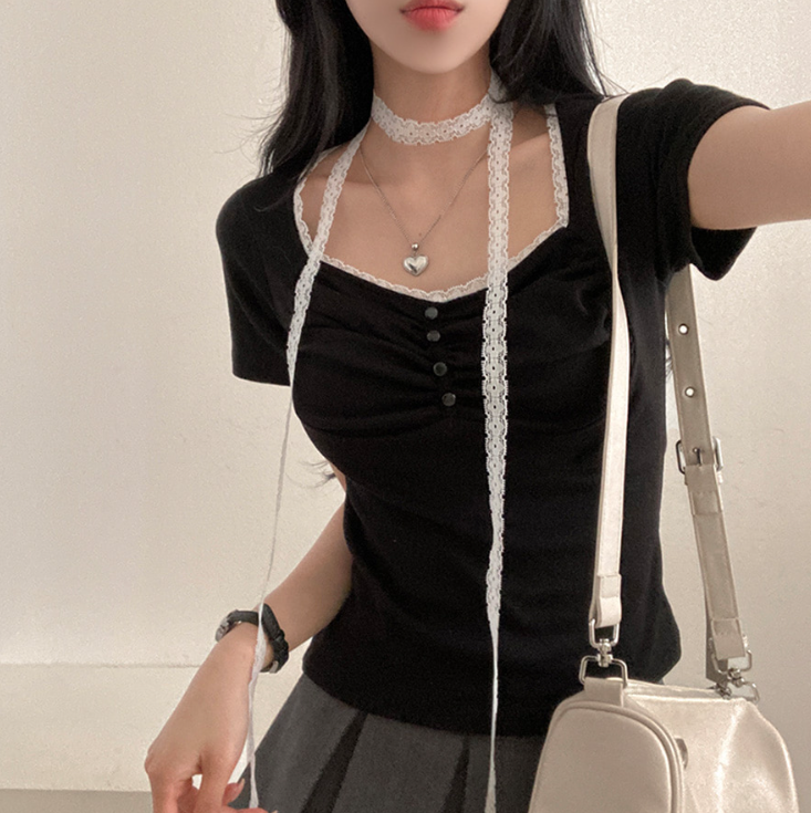 (•‾⌣‾•)領位皺皺設計更顯胸型美感💕比普通T恤更有特色❤️配上小蕾絲美觀又獨特